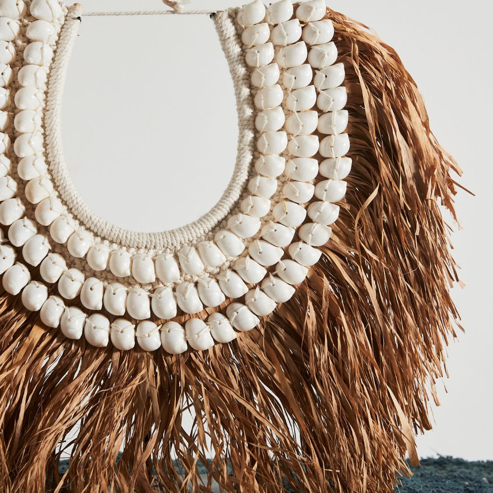 Immerse yourself in the exquisite allure of this stunning masterpiece, meticulously crafted from the essence of raffia and adorned with exquisite seashell embellishments.