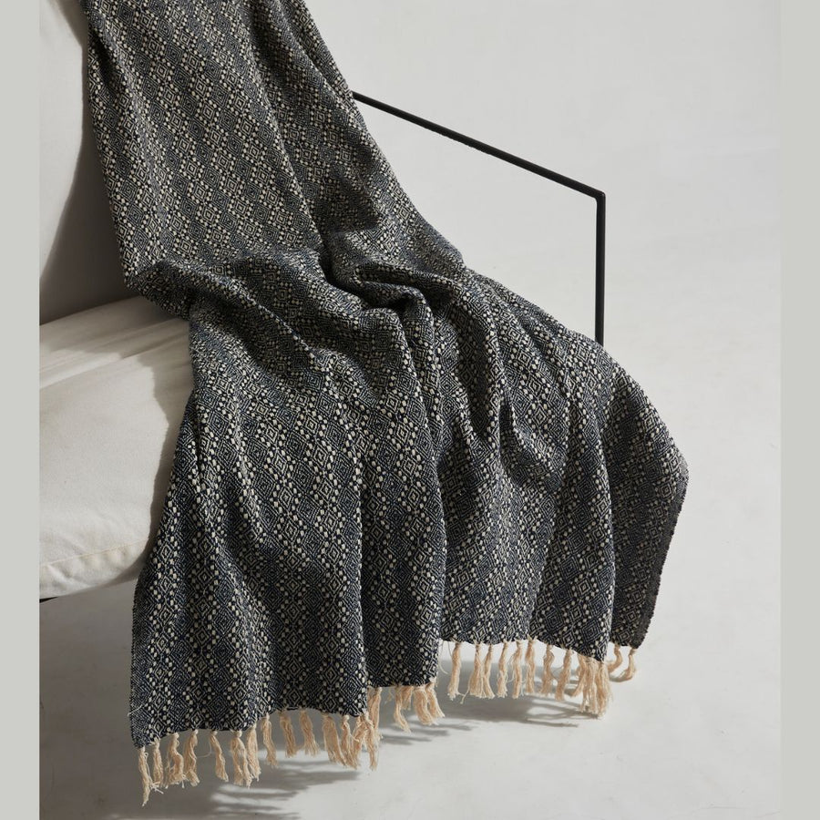 This versatile, elegant throw is inspired by the serene colors of navy and cream, showcasing a captivating dual-tone effect. The soothing colours and intricate patterns of this Diamonte Cotton Throw with Tassels create a welcoming atmosphere in any space.