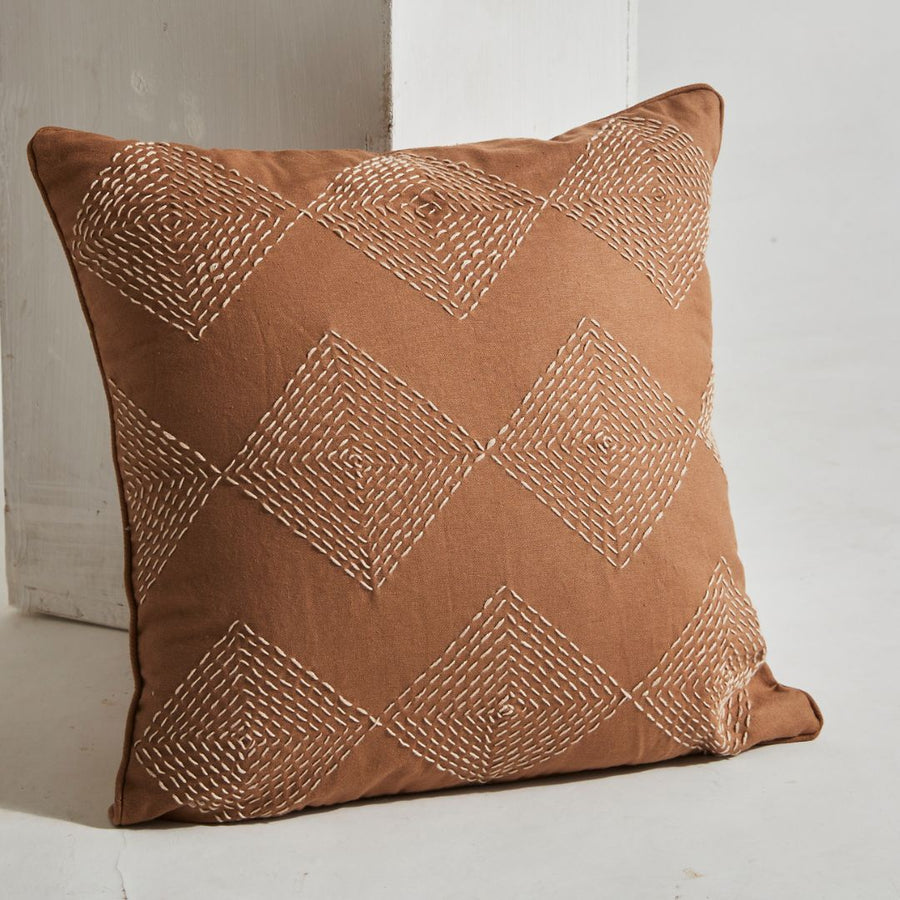 The Earth Boho Cushion captures attention with its elegant simplicity, as it is skilfully crafted by hand using exquisite cotton material in a soft clay hue, adorned with intricate cream stitching.