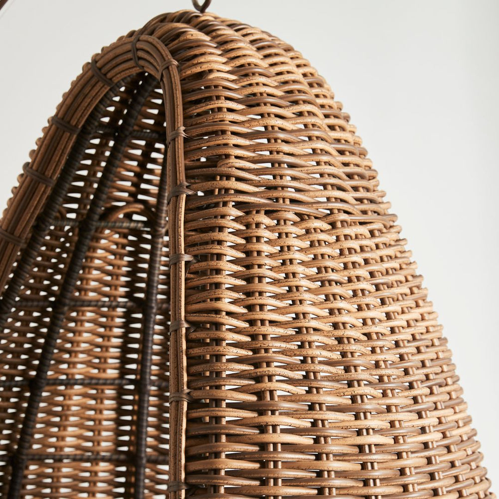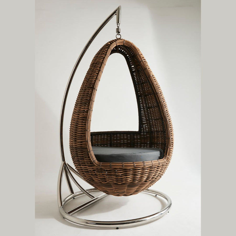 Handcrafted open-back egg chair is the epitome of relaxation. Designed with 100% hand-woven UV-resistant wicker and a stainless steel solid base. Includes grey seating cushion.