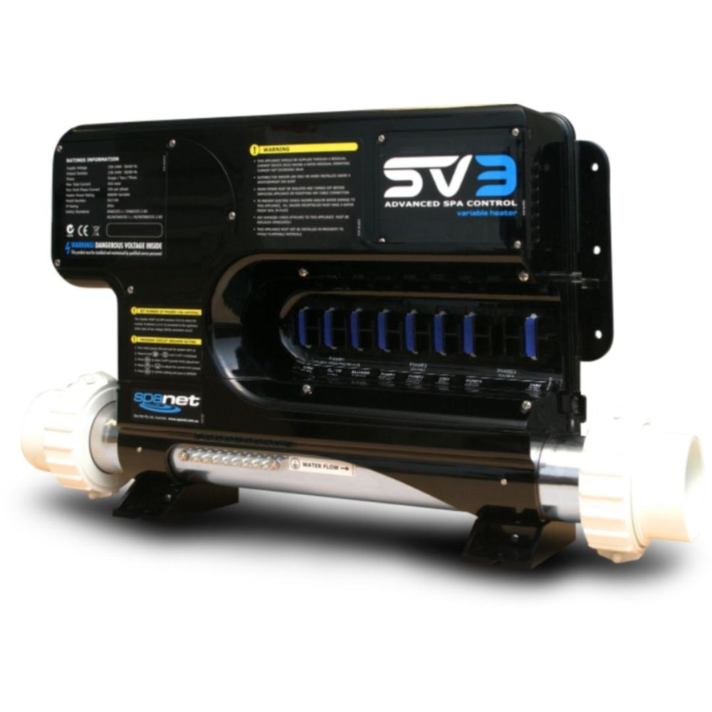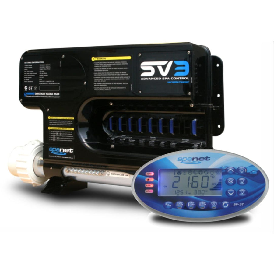 The PowerSMART SV3, the ultimate control for your premium range spas. Designed for operating 2, 3 or 4 pump* spas the SV3 sets a new standard featuring Smart Variable Heater technology with Dynamic Thermal Tuning, a complete heat pump interface for cost effective heating and cooling of your spa, PowerSAVE technology for lower daily operating costs as well as a host of industry leading features and flexible configuration options. Coupled with an attractive, simple to use touch pad with large, easy to read backlit display, the SV3 is your ideal spa control choice.