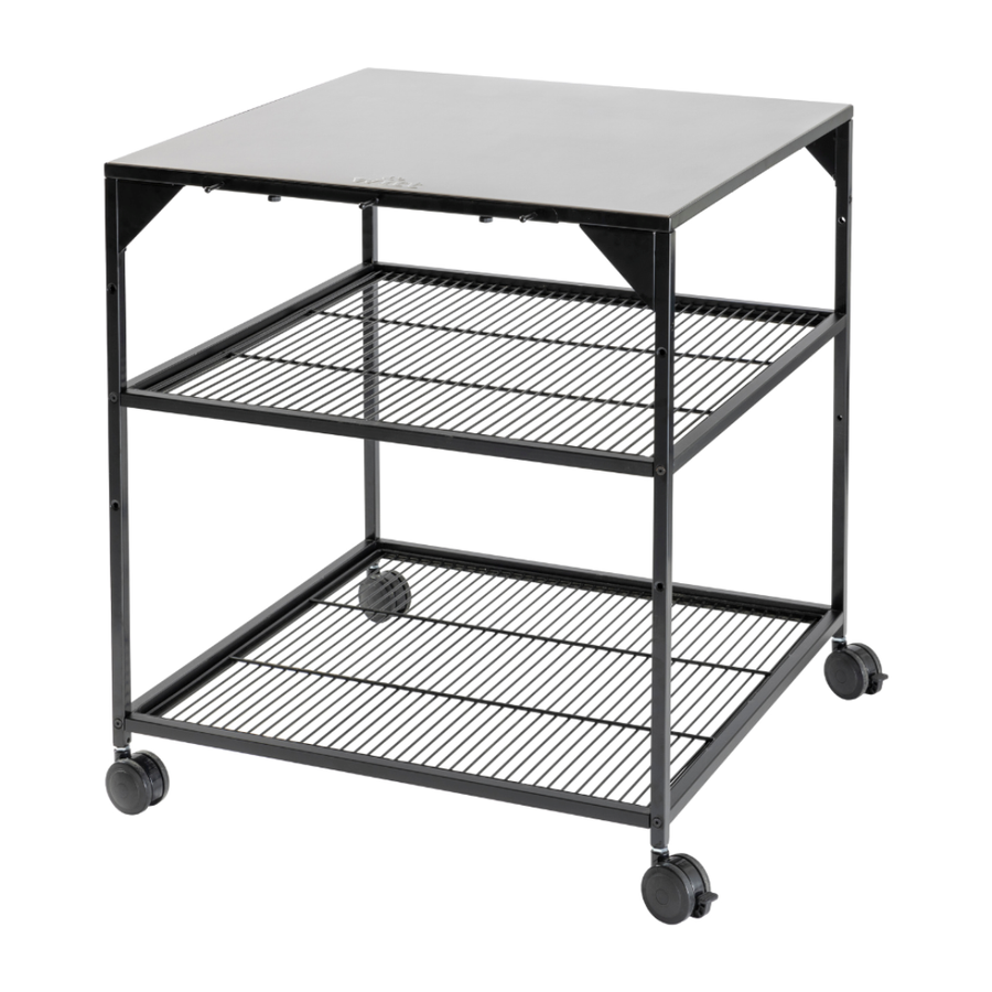 Black powder-coated steel table with 4 lockable wheels. Stainless steel top and 1 Accessory Rack included (additional Accessory Rack can be purchased).